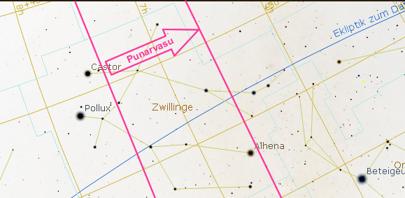 Die beiden Hauptsterne Castor und Pollux des Sternbildes Zwillinge, die dem Nakshatra Punarvasu zugeordnet werden, galten in der griechischen Mythologe als göttliche Zwillinge, die Dioskuren. Castors Vater war der weltliche König Tyrandeos, sein in der gleichen Nacht gezeugter Zwillingsbruder Pollux (Polydeukes) hatte jedoch Zeus zum Vater.