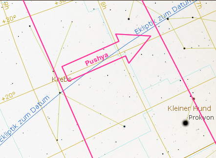 Pushya lässt sich übersetzen mit „ernähren, Nahrung“. Die Fixsterne Asellus Borealis und Australis heißen übersetzt „nördlicher und südlicher Esel“. Im dazwischen liegenden Sternhaufen Praesepe wurde im Altertum eine (Futter)Krippe gesehen, die den beiden Eseln als Nahrungsquelle dient. Die Konstellation lässt sich auf eine Geschichte der griechischen Mythologie zurückführen (die Esel als Lasttiere des Dionysos). Auch die Bibel scheint sich in Jesaja auf diese Konstallation zu beziehen: „Ein Ochse kennt seinen Besitzer, und ein Esel die Krippe seines Herrn, [aber] Israel hat keine Erkenntnis; mein Volk hat keine Einsicht.“ Das Wort „Krippe“ kommt im Neuen Testament nur noch in Zusammenhang mit der Geburt des Jesuskindes vor, das Maria im Stall in eine Futterkrippe legt. Die Krippe deutet an, dass dort für diejenigen, die Erkenntnis suchen, Nahrung zu finden ist.